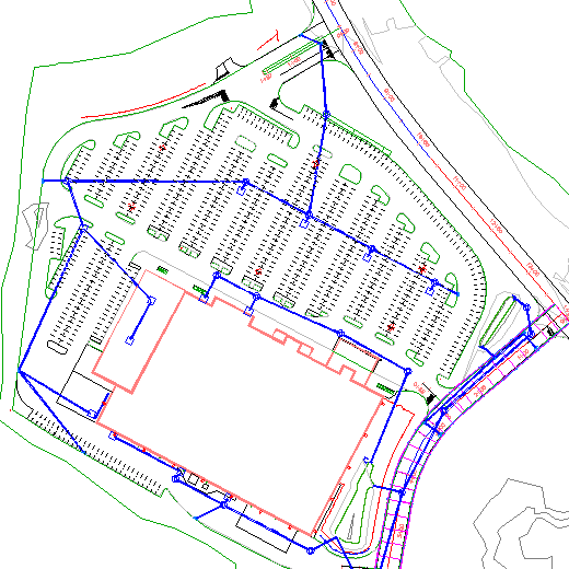 Este desenho contém um site comercial, que consiste em um perímetro de construção, um estacionamento e ruas de acesso.
