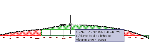 Observe que a dica de ferramentas exibe o número da estaca atual (3+25) e o volume (aproximadamente 1500.00 cu. Yd.).