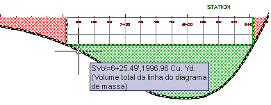 Observe que o ponto mais alto do verde da área da distância de transporte sem custo é de estaca 3+25. Este é o ponto de declividade que é o ponto no qual a remoção gratuita faz a transição de corte para aterro. Dependendo das condições do terreno, pontos de declividade podem ser localizações lógicas para sites de despejo ou bancos de areia, o que pode reduzir ou eliminar a sobre-remoção.