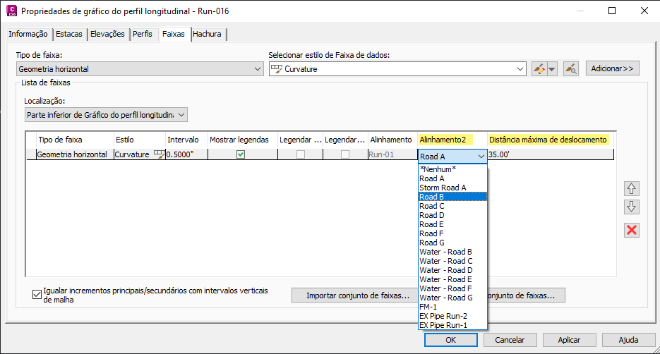 Nota: O Alinhamento2 também pode ser selecionado ao criar novos gráficos do perfil longitudinal.