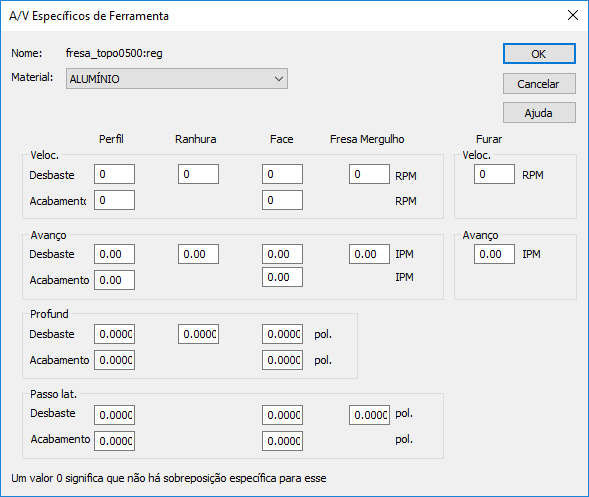 - Altere qualquer valor de Avanço, Velocidade, Profundidade e Passo Lateral e clique em OK.