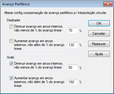 Selecione Diminuir avanço em arcos internos para diminuir a velocidade em movimentos côncavos. Configure o limite inferior inserindo uma porcentagem do avanço linear.