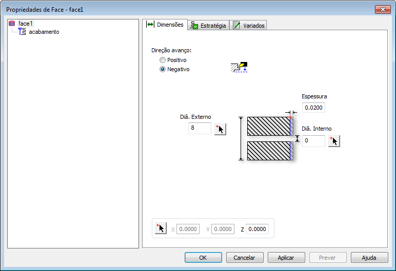 Direção avanço — Selecione Positivo caso deseje cortar na direção +X ou selecione Negativo caso deseje cortar na direção -X.
