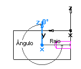 Ao criar indexação 4º eixo ou peças de torneamento/fresamento, existe uma opção na página Posição do Assistente de Nova Figura para posicionamento chamada Radial sobre eixo X (ou Radial sobre eixo Y se a indexação for em torno do eixo Y). Utilize esse método de posicionamento de figuras 4º eixo, a menos que deseje criar setups em cada face que deseja usinar. Utilize as dimensões de ângulo e raio para orientar a figura na face apropriada.