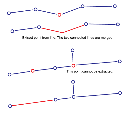 If you delete a point, you must update the network topology to keep the network consistent. For example, if you delete a network point, you must merge the two connected lines. If more than two lines are connected at the point, you are not allowed to delete the point.