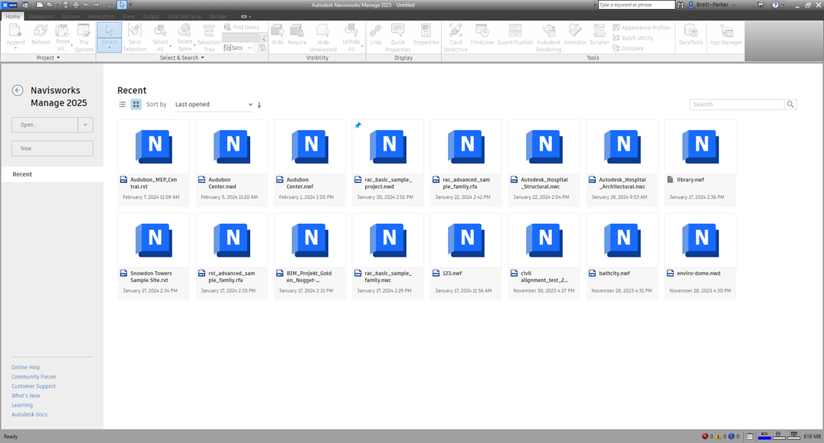 Use a Tela inicial do Navisworks para abrir qualquer tipo de arquivo compatível.