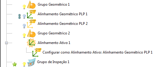 Neste exemplo, o alinhamento ativo é inicialmente configurado como Alinhamento Geométrico PLP 2 (indicado pelo ícone dourado de alinhamento). Quando o item Alinhamento Ativo 1 é iniciado, restaura o alinhamento ativo para Alinhamento Geométrico PLP 1: