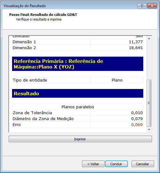 Role para baixo para exibir informações sobre a referência utilizada, a zona de tolerância e valor de erro. Por exemplo: