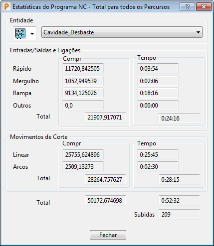 Você pode exibir o comprimento e valores de tempo para todas as entradas, saídas, ligações e movimentos de corte, assim como o número de subidas no Programa NC selecionado.