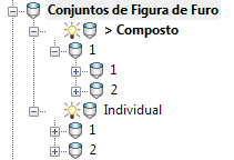 Você pode notar a diferença entre a representação de um furo composto e um furo individual nos Conjuntos de Figura de Furo criados.