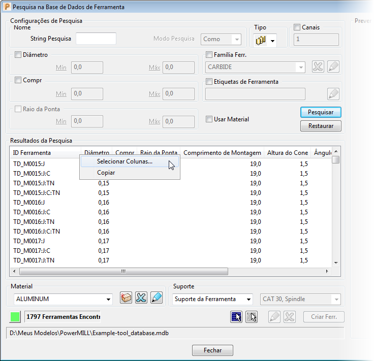 Para copiar dados para os diálogos Programa NC ou Base de Dados de Ferramenta, clique com o botão direito no cabeçalho da coluna e selecione Copiar.