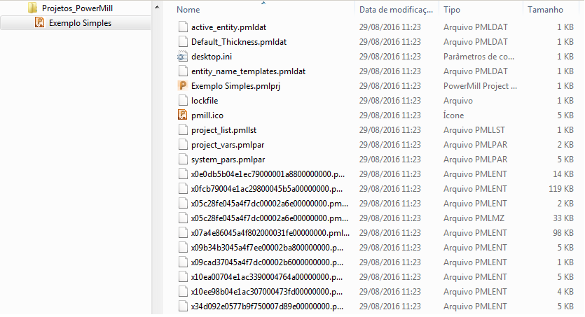Se você abrir a pasta de projeto no Windows Explorer, pode visualizar os arquivos criados pelo PowerMill: