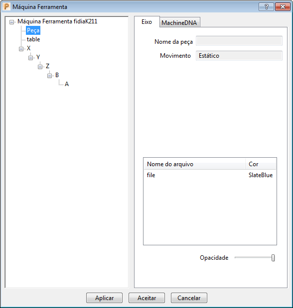 — Movimente a barra deslizante Opacidade para controlar a opacidade da máquina ferramenta ou da peça selecionada da máquina. Movimente a barra deslizante para a esquerda para diminuir a opacidade; movimente a barra deslizante para a direita para aumentar a opacidade.