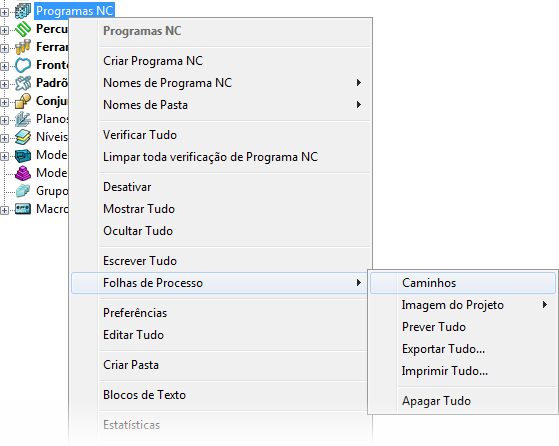 1. No menu de contexto Programas NC, selecione Folhas de Processo > Caminhos.