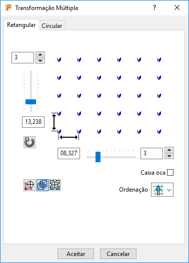 Transformações de percurso permitem que você movimente, rotacione ou espelhe um percurso. Percursos podem ser facilmente dispostos de forma retangular e circular. O PowerMill exibe uma pré-visualização da transformação, que permite uma verificação visual antes da transformação do percurso.