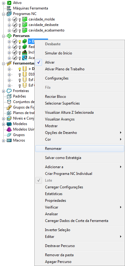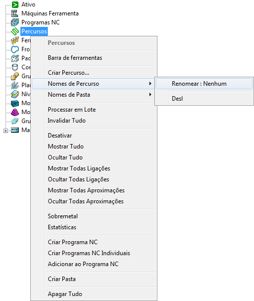 Clique com o botão direito numa entidade individual para visualizar o menu de contexto para a entidade específica. Por exemplo, clique com o botão direito num percurso para visualizar as opções disponíveis para esse percurso específico.