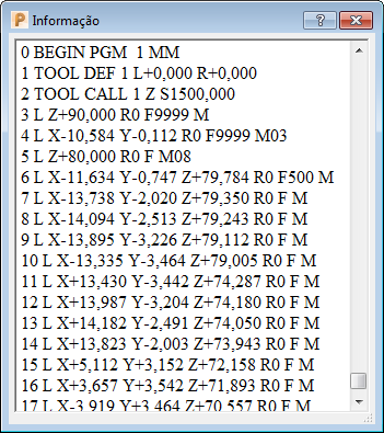 - Vista — Clique para exibir um arquivo de Programa NC pós-processado num diálogo de informação. Por exemplo: