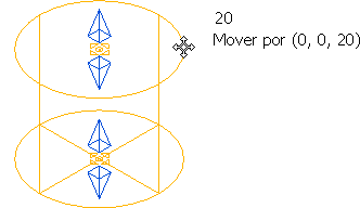 . Clique e arraste o mouse para mover a figura de furo. O texto próximo ao cursor exibe a altura Z atual da figura de furo selecionada (nesse caso 20) e por qual distância a figura foi movida (nesse caso 0, 0, 20).