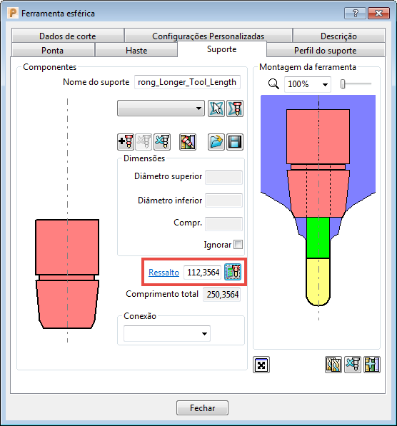 Montagem da Ferramenta — Essa área exibe as porções definidas da montagem da ferramenta além do perfil do suporte.