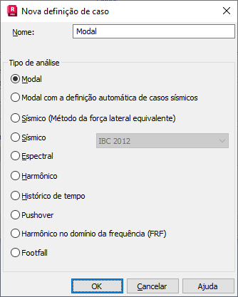 Se a análise modal de uma estrutura não estiver definida, as análises dinâmicas de estrutura (espectro sísmico, análise espectral e histórico de tempo) não estarão disponíveis. Para análise espectral, análise sísmica e análise do histórico de tempo, use os resultados obtidos durante a análise modal da estrutura. A definição dos parâmetros dessa análise deve ser precedida pela definição de uma análise modal de uma estrutura. É possível definir vários casos de análises modais de uma estrutura, cada uma definida por um conjunto diferente de parâmetros (matrizes de massa diferentes, valores de amortecimento e outros). As análises de espectro sísmico, espectral e histórico de tempo são executadas para o parâmetro definido para a análise modal, que está localizado na lista de cargas da estrutura.