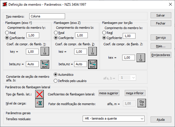 O campo Coeficiente do comprimento de flambagem é usado para especificar os coeficientes dos comprimentos de flambagem de um membro nas direções x, y e z (key, kez e kex – flambagem por torção). O comprimento real do membro (ou a soma dos comprimentos dos membros do componente) é inserido automaticamente nos campos apropriados. Para a flambagem por torção, o comprimento é usado conforme especificado na seção 8.4.4.1 da norma.