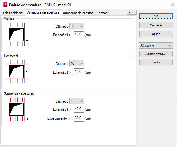 A guia Armadura da abertura permite definir os parâmetros da armadura da abertura para a norma BAEL.