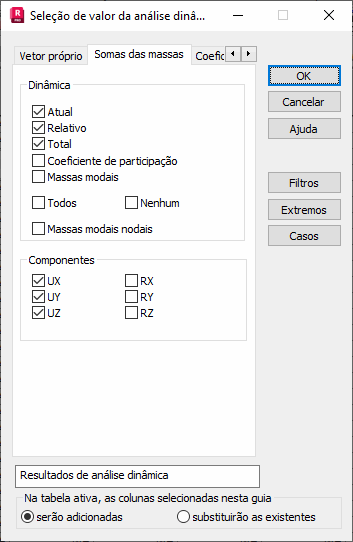 Selecione a guia Somas das massas, na caixa de diálogo Colunas da tabela para selecionar os parâmetros de soma das massas para apresentação.