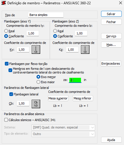 O campo Tipo de membro exibe o nome do tipo de membro selecionado (insira o nome do tipo de barra definido). Os campos Flambagem em relação ao eixo Y e Z exibem o comprimento de um membro para o plano apropriado.