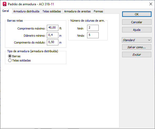 Define o número mínimo e máximo de colunas de armadura.
