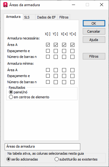 Selecione a guia Armadura, na caixa de diálogo Áreas de armadura, para selecionar as quantidades de armaduras de laje e casca para apresentação.