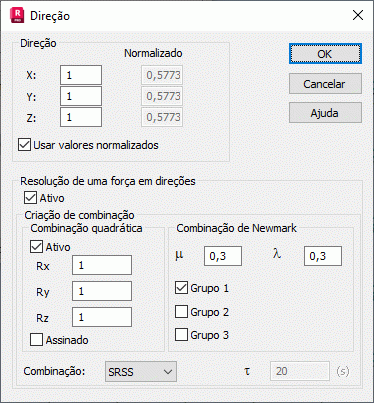 A opção Resolução de uma força (sísmica/espectral) em direções gera três casos sísmicos que diferem na direção da excitação. A direção de excitação (X,Y,Z) definida na parte superior da caixa de diálogo é devidamente resolvida para o caso: (X,0,0) (0,Y,0), (0,0,Z). Os nomes dos casos recém-criados contêm informações indicando em qual direção a excitação está definida. Portanto, os valores definidos nos campos X, Y, Z são componentes do vetor de excitação. Selecione a opção Usar valores normalizados para escalar valores de componentes, de forma que o vetor resultante seja um vetor unitário.