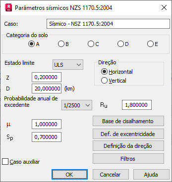 Para executar a análise sísmica de acordo com as regras fornecidas na norma NSZ 1170.5:2004, defina os seguintes parâmetros: