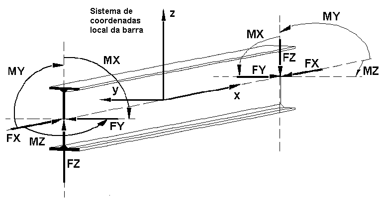 A convenção de sinais para elementos de barra é baseada na convenção usada para as forças de seção. As forças de seção apresentam o mesmo sinal se produzirem o mesmo resultado no final de uma barra que o resultado produzido por forças nodais positivas aplicadas no nó inicial da barra. Essas forças são aquelas cuja direção está em conformidade com a direção dos eixos do sistema de coordenadas local. Portanto, as forças de compressão são positivas, enquanto as forças de tensão são negativas. Os momentos fletores positivos MY produzem tensão nas fibras de vigas que estejam localizadas no lado negativo do eixo de coordenadas local z. Os momentos fletores positivos MZ produzem tensão nas fibras de vigas que estejam localizadas no lado positivo do eixo de coordenadas local y.