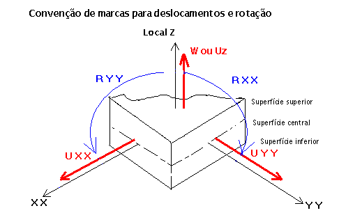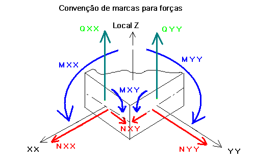 Os resultados obtidos para elementos finitos planos são apresentados em sistemas de coordenadas locais que são definidos pelo usuário e modificados a qualquer momento da apresentação dos resultados. Os resultados obtidos para estruturas que contêm EF plana podem ser apresentados na forma de isolinhas ou mapas de cores em elementos selecionados. A opção Valores, que seleciona Com descrição por padrão, também está disponível. As descrições de valor da estrutura de placa ou casca nos centros dos elementos serão apresentadas sem mapas de desenho ou isolinhas.
