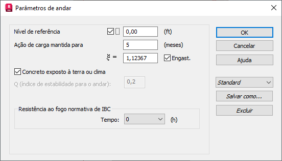 A caixa de diálogo Parâmetros do andar permite definir os parâmetros de um andar de acordo com as normas ACI 318.