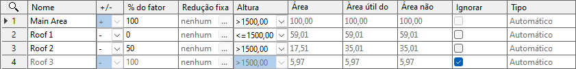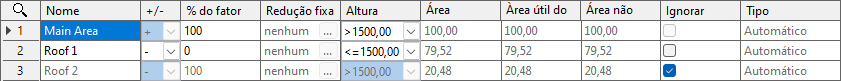 - Telhado 3: indica os dados da subárea da área acima da linha de altura de 2,00 m. A área é adicionada à área de ambiente. Essa área foi definida como Ignorar por padrão e é somente leitura nesta caixa de diálogo. Por isso, o valor da subárea é subtraído da área principal, e o resultado é calculado corretamente no identificador de ambiente. Quando você resume a área líquida do ambiente da subárea, é possível ver que o resultado da NRA corresponde à área principal.
