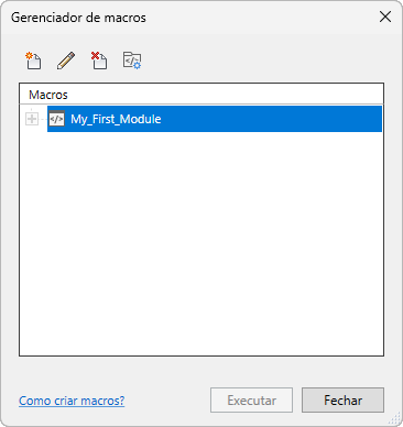 O novo módulo é criado e listado no Gerenciador de macros. Uma ou mais macros podem ser adicionadas agora.