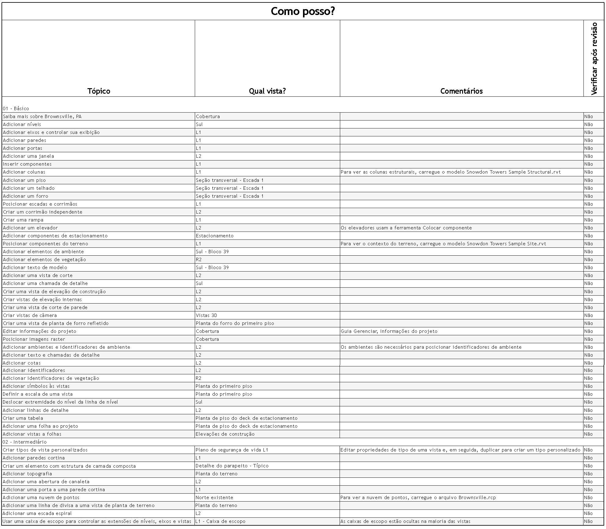 A vista da tabela denominada: Como listo todos os tópicos da Ajuda na ordem de simples para mais complexos. É possível usar essa vista como um “tour guiado” para visitar todos os tópicos de ajuda em sequência e verificá-los enquanto explora o projeto.