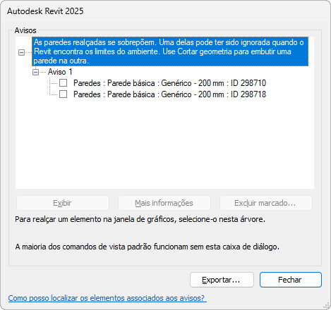 Expanda os itens para visualizar elementos individuais associados a cada aviso. Quando o texto junto a um aviso é selecionado, o elemento é realçado em todas as vistas abertas onde está visível.