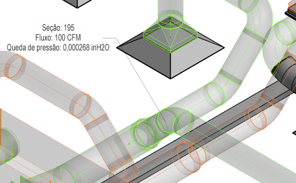 Inspecione e visualize a queda de pressão e os dados de fluxo em redes de projeto e fabricação. Os segmentos analíticos são expostos na interface do usuário como subelementos. Esses segmentos podem ser selecionados, identificados e tabulados.