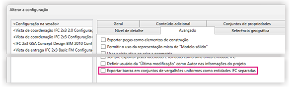 - Use a opção para exportar barras em conjuntos de vergalhões uniformes como entidades IFC separadas: