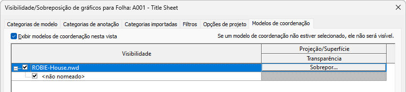 Após vincular um modelo de coordenação a um modelo do Revit, use a caixa de diálogo Visibilidade/Gráficos para definir a visibilidade e transparência. Use a configuração da transparência para distinguir o modelo de coordenação do modelo do Revit.