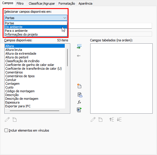 A tabela de portas é aberta. Como os campos Para o ambiente e Do ambiente não refletem automaticamente as alterações feitas na abertura da porta após a mesma ser colocada, é possível editar estes campos ao selecionar um valor na lista.