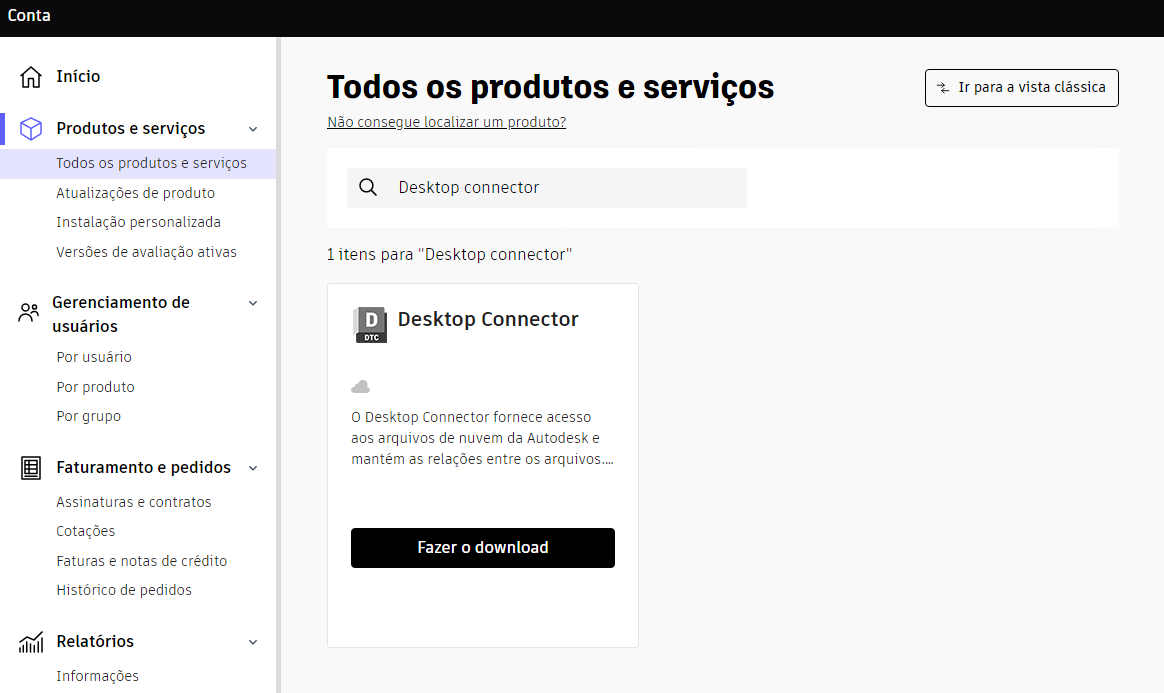 Para fazer o download da versão mais recente, acesse Produtos e serviços da Autodesk Account. O Desktop Connector é exibido em Produtos e serviços.