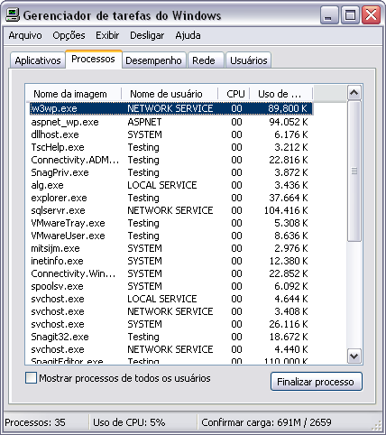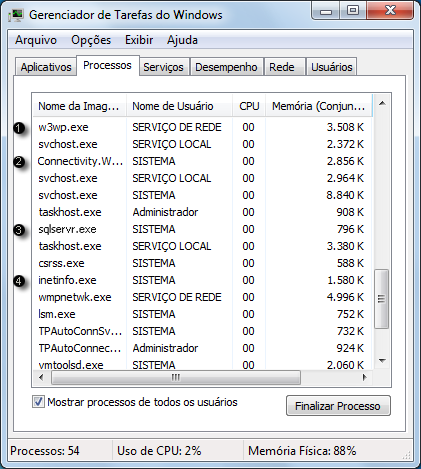Se você suspeitar de que o servidor tem uma quantidade inadequada da memória, ative o valor Total de carga comprometida. Clicar na guia Processos revela mais detalhes sobre o uso da memória de todos os programas ou processos.