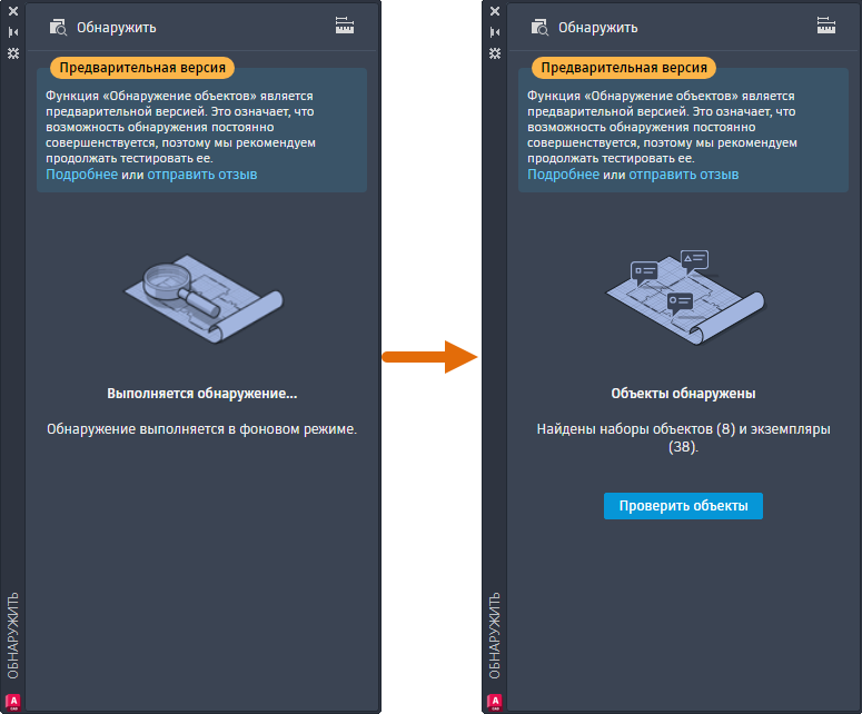 При запуске обнаружения объектов геометрия чертежа отправляется на распознавание в службу машинного обучения AutoCAD. После анализа чертежа службой на палитре отображается уведомление о том, были ли обнаружены объекты, которые можно преобразовать в блоки. Для дальнейшей проверки и оценки выявленных экземпляров нажмите кнопку «Проверить объекты».