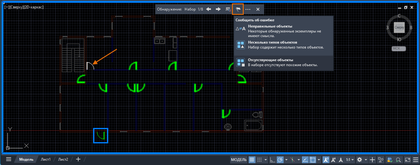 В режиме проверки панель инструментов «Обнаружение» отображается в верхней части окна чертежа. На этой панели представлены различные параметры для навигации по обнаруженным объектам и управления ими. Результаты обнаружения группируются в наборы подобных объектов. Набор представляет собой группу обнаруженных подобных объектов, которые можно преобразовать в экземпляры одного блока.