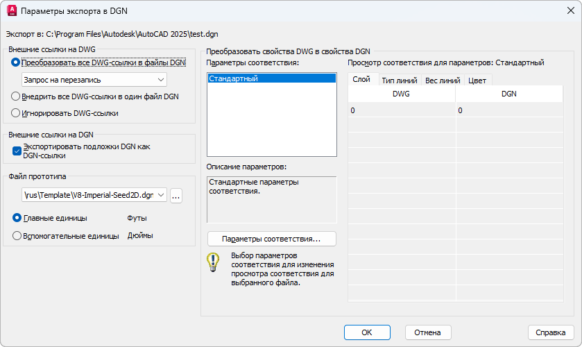 Позволяет выбрать и настроить параметры соответствия, используемые для текущего экспорта в DGN.