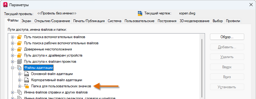 Пользовательские профили являются именованными коллекциями приложения и настройками среды чертежа. Эти настройки включают в себя цвет окна чертежа, размер курсора, шрифт окна команд, орфографический словарь и т. д.