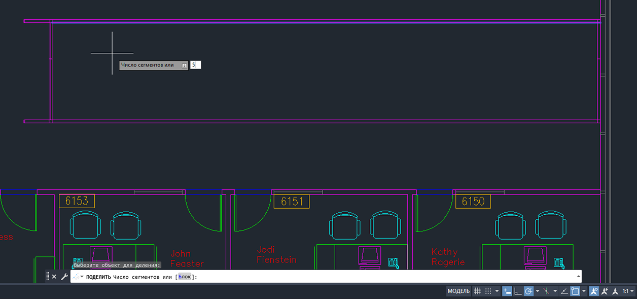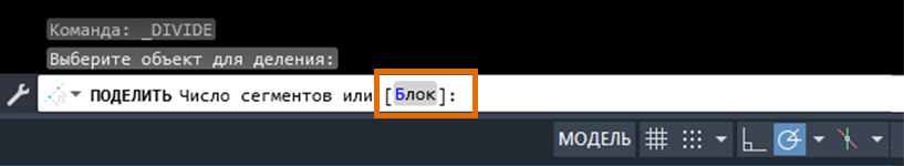 ПОДЕЛИТЬ | Создание объектов-точек или блоков, размещенных на равном расстоянии друг от друга, вдоль длины или периметра объекта. |